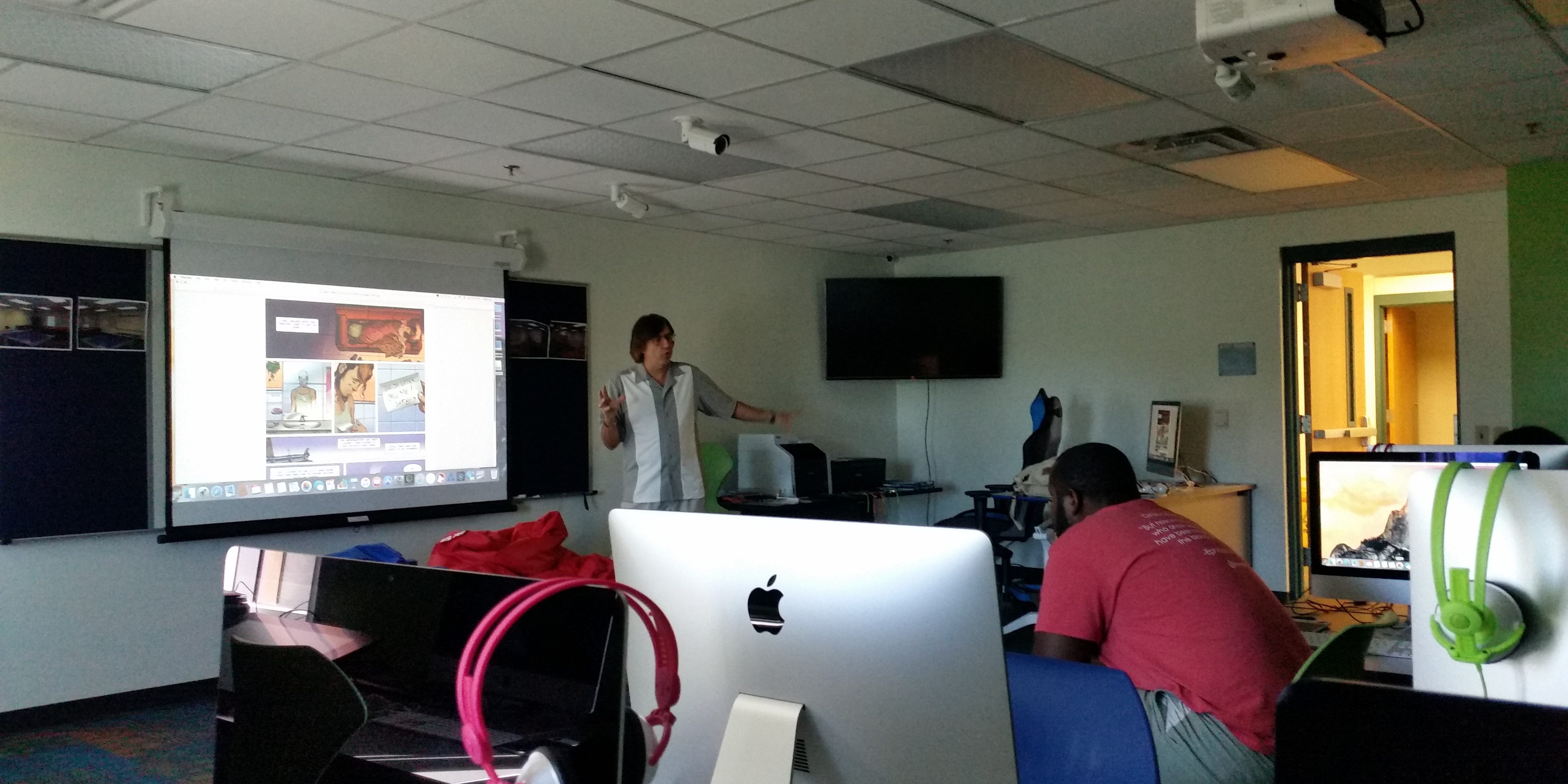 It’s Saturday morning, and Michael Lyman is teaching a class on creating graphic novels. He gestures at a screen filled with giant comic-book panels, pointing to one showing soldiers marching across a bleak landscape.